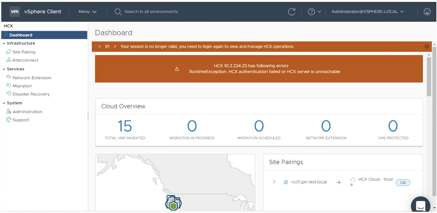 Symptoms: When logged into the vCenter Cloud Gateway Appliance (VCGA) and opening the HCX plug-in in case of Hybrid Linked Mode, the following error message is displayed. ・Message : "RuntimeException: HCX authentication failed or HCX server is unreachable"