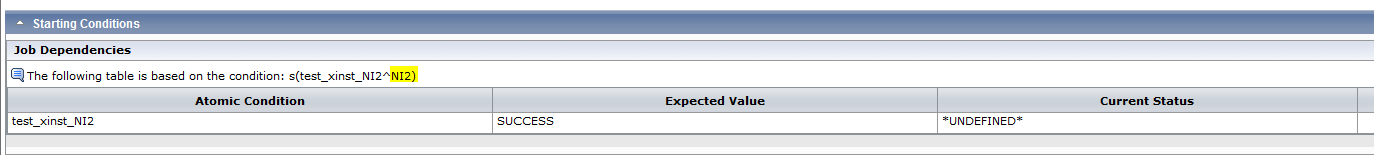 In QuickView under "Starting Conditions", the "Current Status" column for a cross-instance dependency shows as *UNDEFINED*.