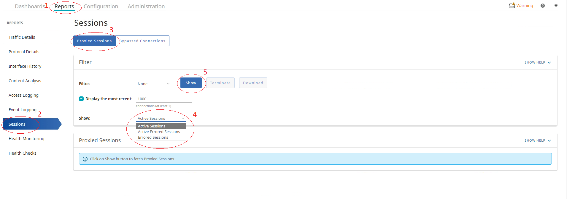 To view the Active Sessions, Active Errored Sessions, and Errored Sessions navigate to Reports > Sessions and Select Proxied Sessions. Select Active Sessions, Active Errored Sessions, or Errored Sessions from the Show list and then click Show.