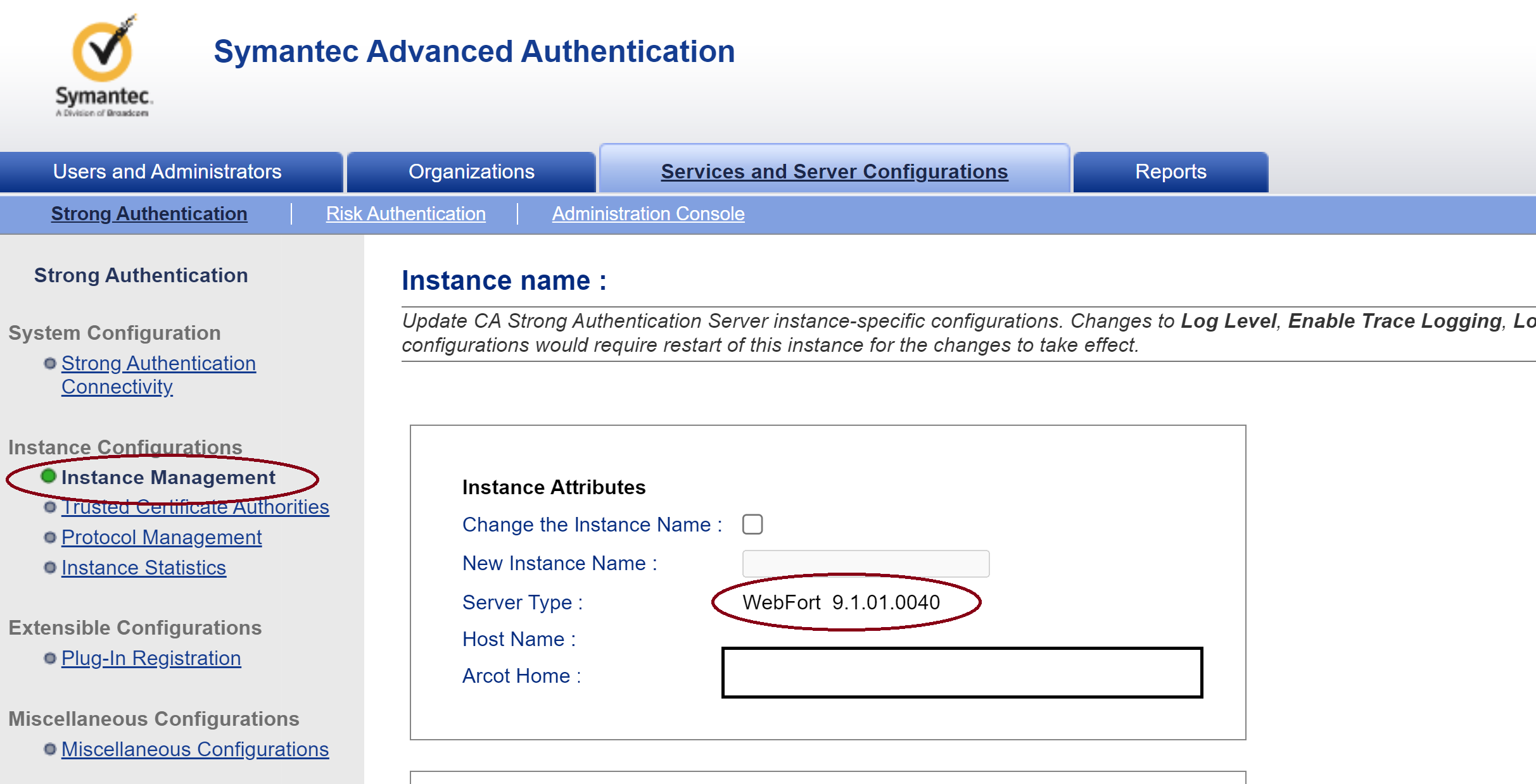 DB query to get server instances version: Strong Authentication: select HOSTNAME,INSTANCEVER from ARWFINSTANCES; Risk Authentication: select HOSTNAME,INSTANCEVERSION from ARRFINSTANCES;