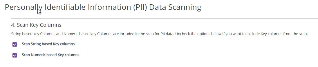 Due to the internal dependencies of the key columns and defaults settings of the PII scan implementation, for this use case to work, select "Scan Numeric Based Key columns" option during the PII scan.