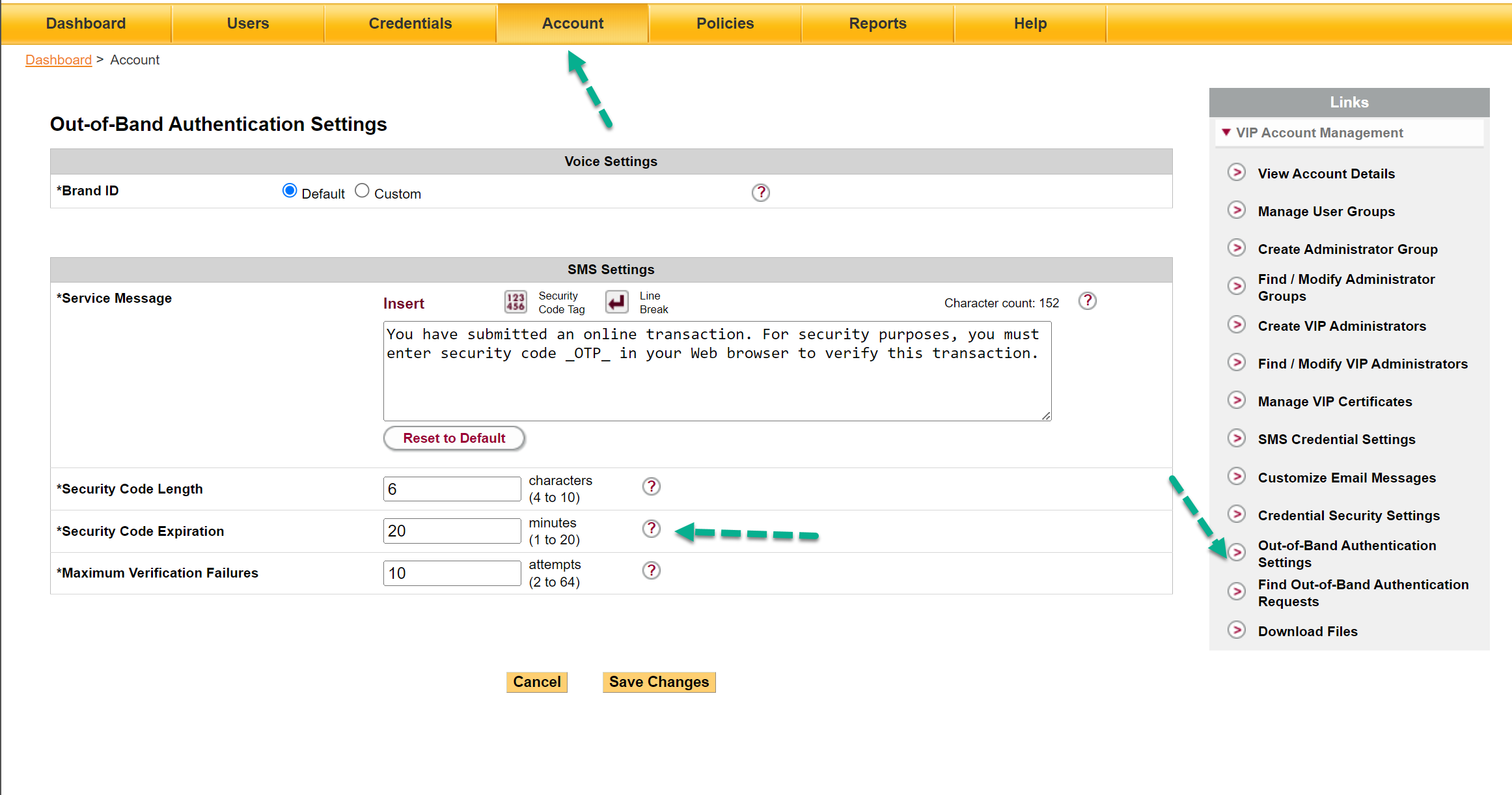 Out of band security code settings are governed by the below configuration in VIP Manager. The default value is set to 20 minutes which is the max a Security is valid for.