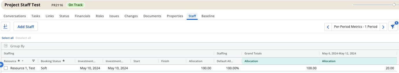 4 On the Staff grid, the Grand Totals based Allocation matches with that of the Per-Period metrics based Allocation, for the single day allocation for both resources