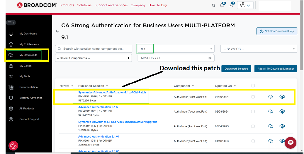 Ensure that you have the latest version of the patch to benefit from any bug fixes or enhancements. The patch can be downloaded from My Download page of the Broadcom Support website at https://support.broadcom.com. On the My Downloads page, go to the Solutions section and download the Symantec-AdvancedAuth-Adapter-9.1.x-FCM-Patch. Instruction on how to apply is available along with the patch.
