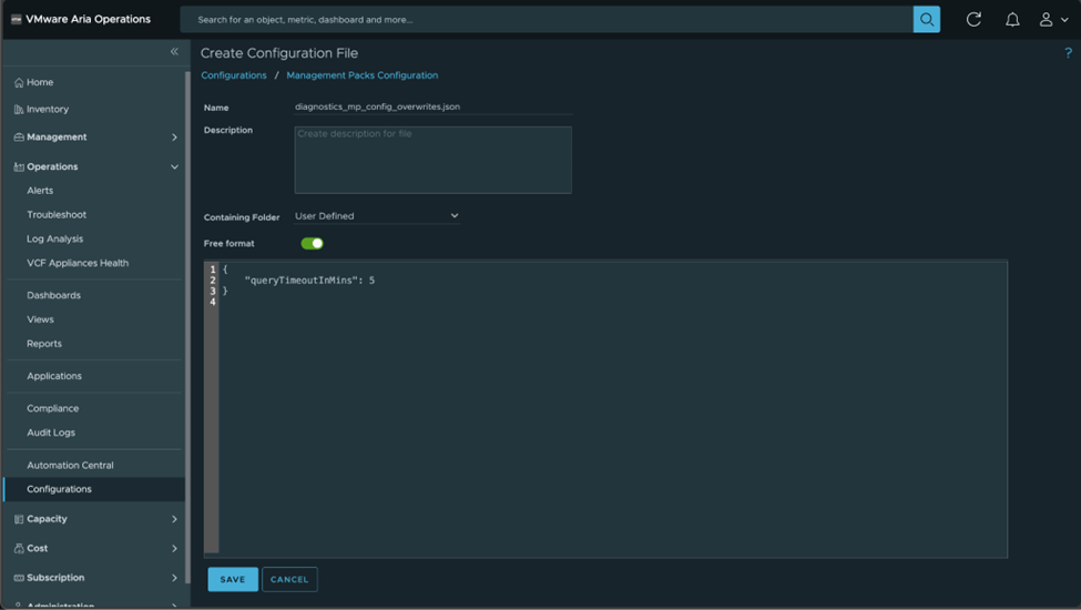 The default timeout can be overridden by using Management Pack Configurations in VMware Aria Operations UI.