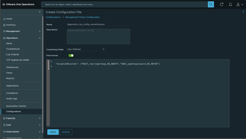 Property or Log based Signatures can be skipped or disabled during scans by updating Management Pack Configurations in VMware Aria Operations UI. Navigate to Operations->Configurations->Management Pack Configurations.