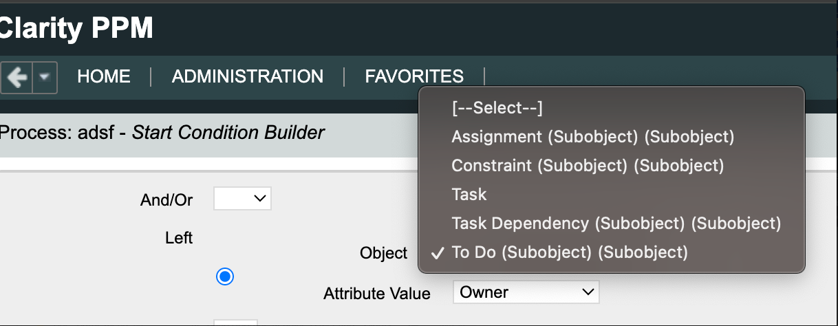 However, let's explore what "Event Enabled" means on the Object properties page, using To Do as an example. Although To Do can't be chosen as a Primary Object, when a process is defined on Task and To Do is a sub-object, it remains available for selection when creating expressions on attributes. This selection isn't influenced by the Event Enabled flag.