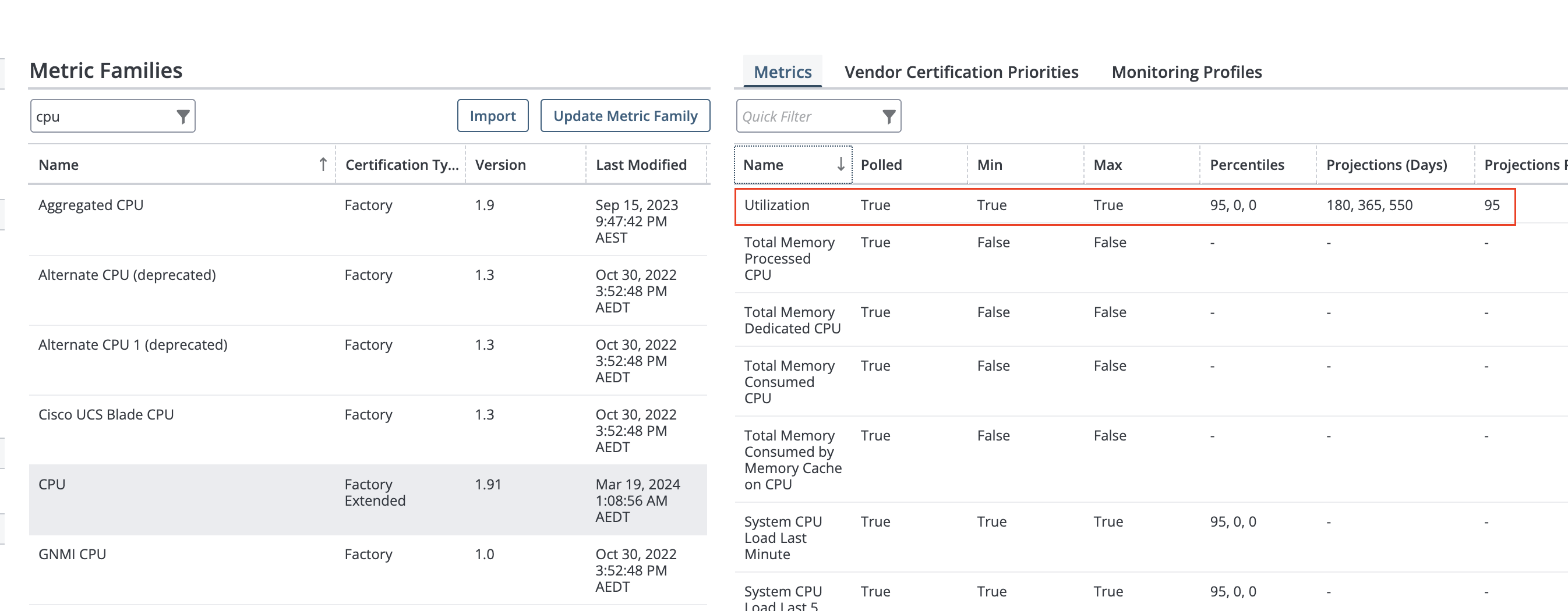 Configured projection reports to project metrics for 18 months, enabled for cpu and memory metrics.