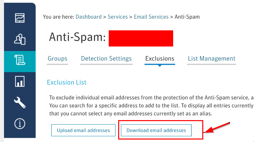 You can download a .csv file of the users to exclude from the AntiSpam service to edit existing addresses, add new addresses offline, and upload the list back to the portal. When saving the list ensure that it is saved in .csv format (comma-separated values, also known as comma delimited).