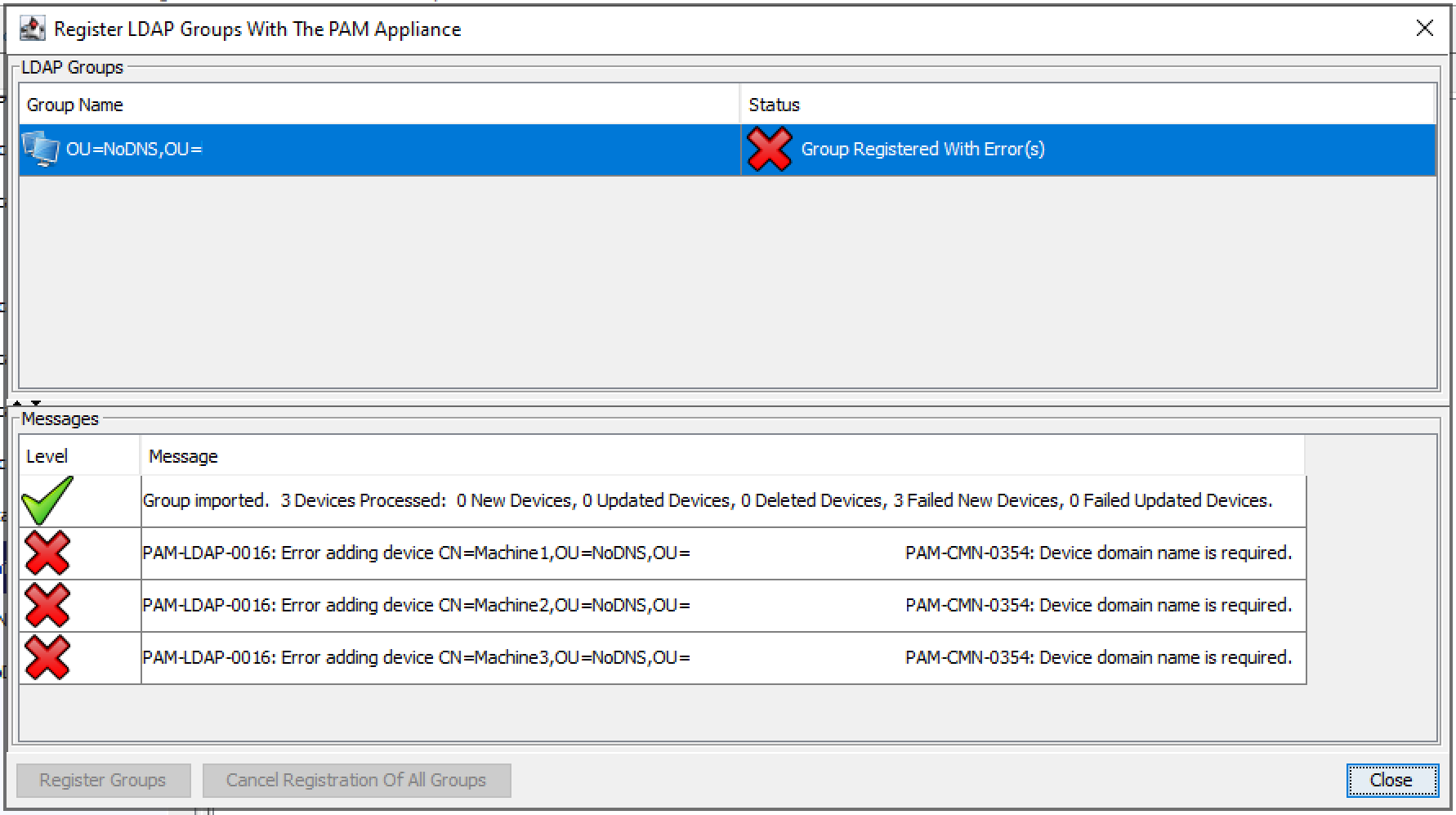 PAM-LDAP-0016: Error adding device CN=Machine1,OU=..... PAM-CMN-0354: Device domain name is required.