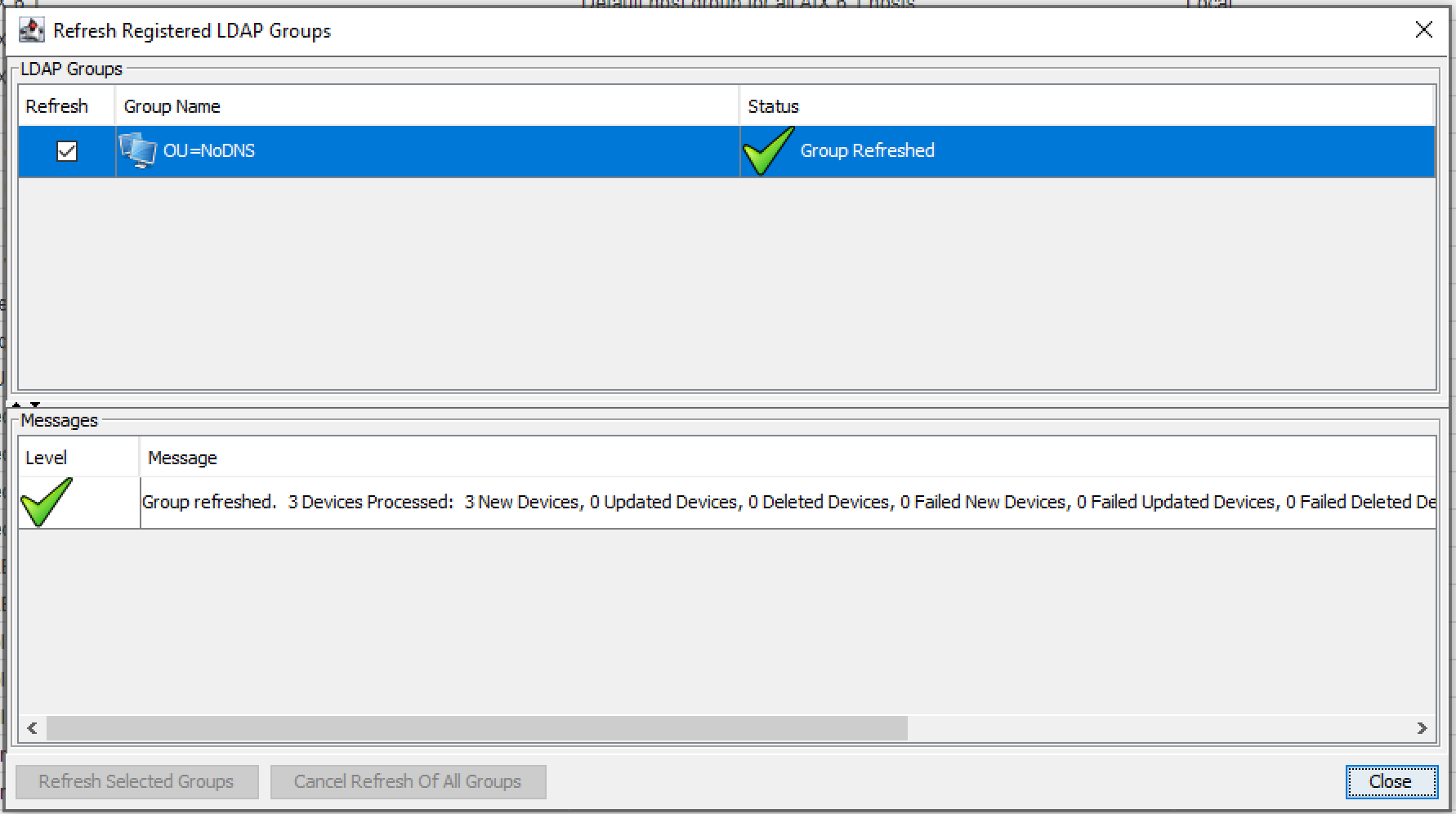 Update the devices in Active Directory and add a DNS host name, then refresh the LDAP device group again. This time the refresh will be successful.