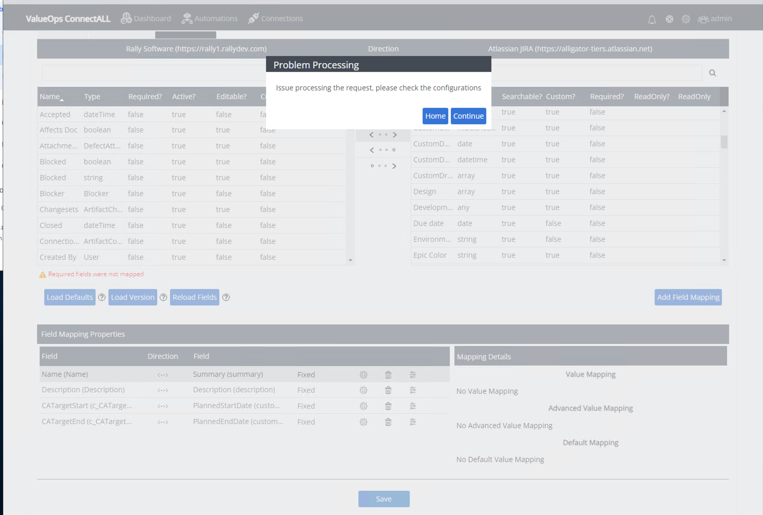 When changing any field mapping for any automation I am getting 'Issue processing the request, please check the configurations' when trying to modify it. This was seen on version 3.2.