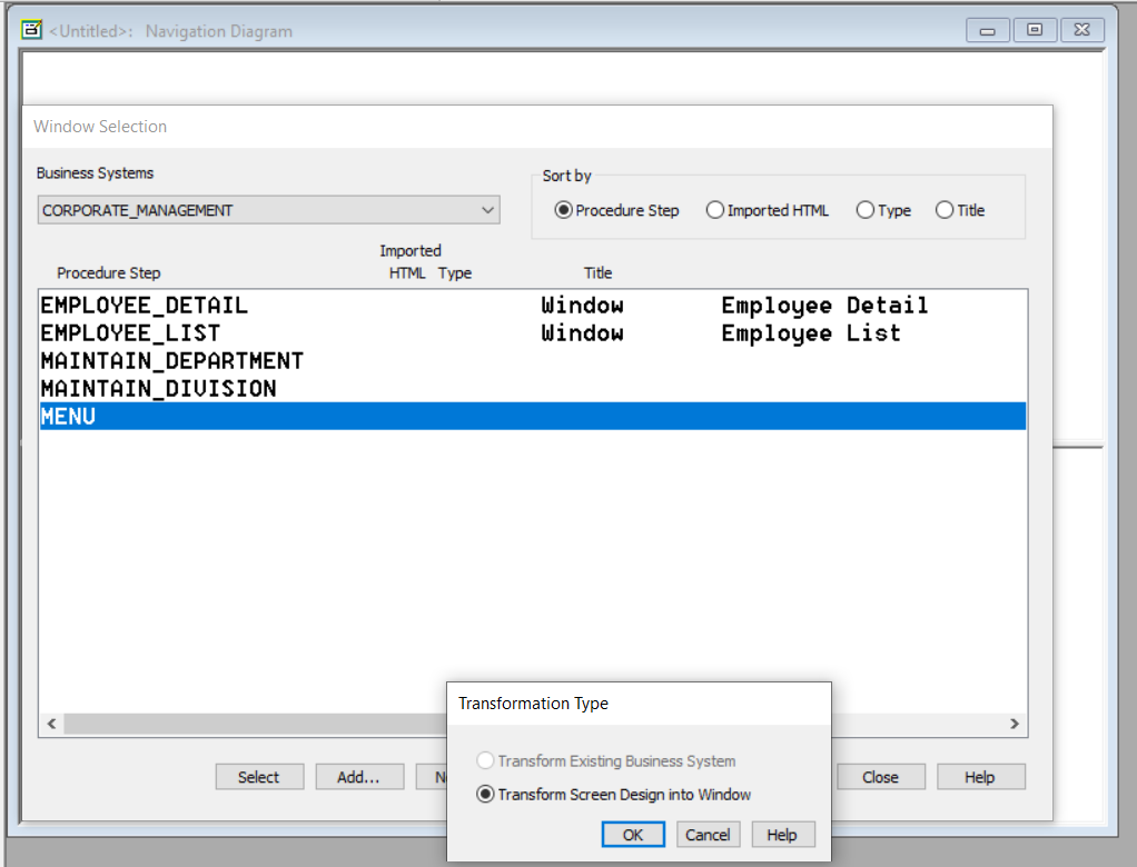 In Navigation Diagram, use Diagram/Open Window and click on a Procedure Step which does not have a window e.g. MENU, to make the Transform button active and clicking it will show the "Transform Screen Design into Window" option enabled.
