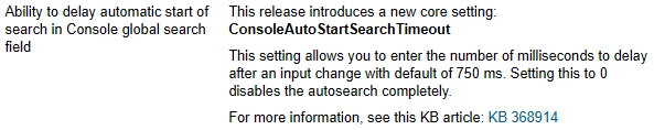 Beginning in the ITMS 8.7.3, there is a new timeout value in Core Settings that allows you to change this. To do this, in the SMP Console go to Settings > Notification Server > Core Settings and create a new Core Setting item named "ConsoleAutoStartSearchTimeout" which accepts values in milliseconds and you can enter the time delay that would work best for your environment. Setting this new core setting to 0 disables the auto-search as shown here: