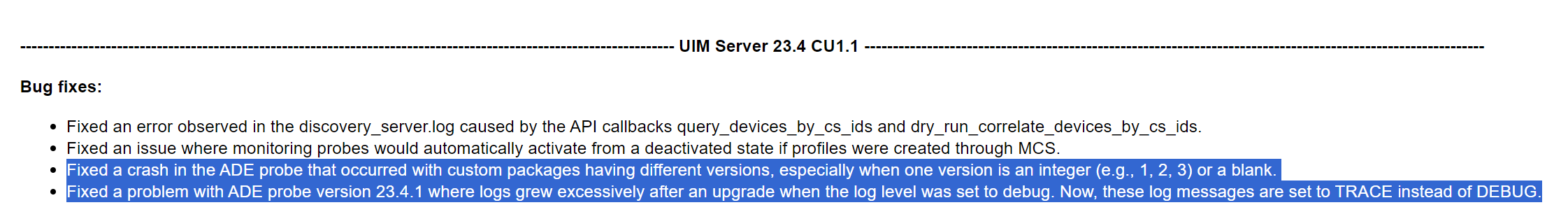 However, this issue was observed to be still intermittently occurring in some environments during upgrade on Primary hub /manual deployment of ade probe on remote hubs having custom packages.