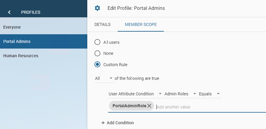 This Configuration would allow members of the Admin Role 'PortalAdminRole' - where 'PortalAdminRole' is configured in Identity Manager: