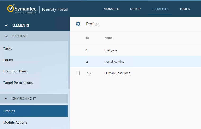 From Identity Portal Admin Console, select menu Elements > from left menu under Environments select Profiles and locate 'Portal Admins'