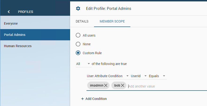This configuration would allow specific user id's 'imadmin' and 'bob' access to Portal Management: