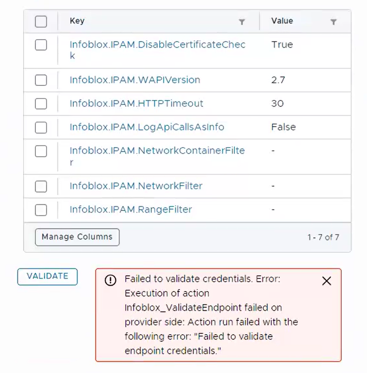 Validating Infoblox integration with Aria Automation Infoblox Plugin 1.5.1 returns "Failed to validate endpoint credentials.", despite valid credentials being used