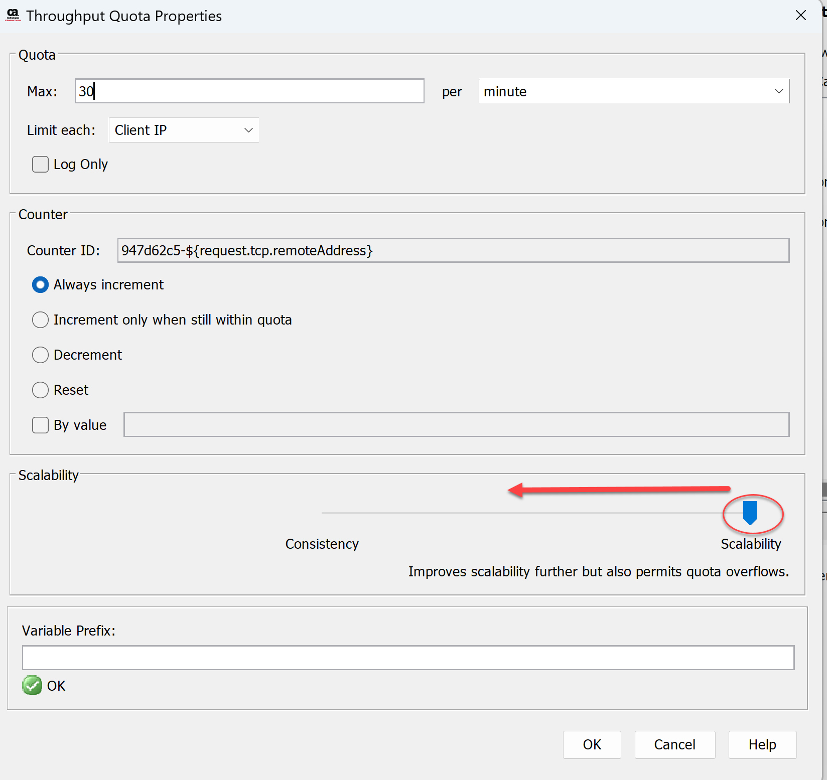 Move the slider to Consistency to have the Gateway enforce the quota restrictions, without exception.