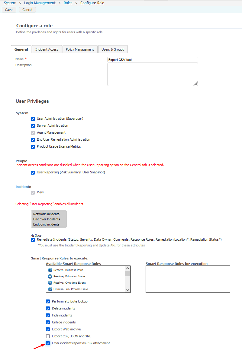 To enable the users to schedule report distribution and to allow them to use the CSV option it will be necessary to review the role configuration which is assigned to them. The "Email incident report as CSV attachment" permission is listed in the Incidents section of the General tab. To grant this right to the role the checkbox must be marked.