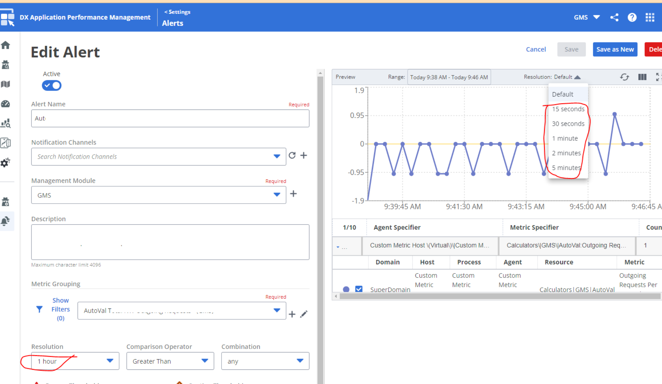 Example: below screenshot shows an alert defined with resolution of '1 hour' yet the graph resolution choices do not include '1 hour' (or many of the other possible alert resolutions)