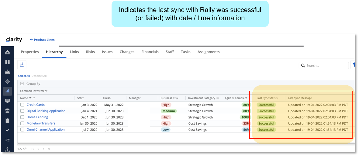 Review the Clarity Grid field 'last sync status' and 'last sync message' for 'Failed in Clarity' or 'Failed in Rally' and 'Updated on' information - There is a 'Last Sync Message' field on the object in Clarity, it has the 'Updated on' time for that object, and the timestamp can be used to correlate with the output of the staging table in 'To Clarity' and 'To Rally' sections from most recently run sync job. - There is also a 'Last Sync Status' that can be used in a filter view to see only those that have failed. - Note: The OOTB Clarity/Rally integration fields for 'last sync status' and 'last sync message' have not been updated since their introduction. They do display values for 'Failed in Clarity' or 'Failed in Rally' when appropriate, but additional detailed information is not readily available.