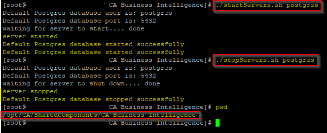 su postgres -c '"/opt/CA/SharedComponents/CA Business Intelligence/postgresql/bin/pg_ctl" stop -D "/opt/CA/SharedComponents/CA Business Intelligence/postgresql/data"'