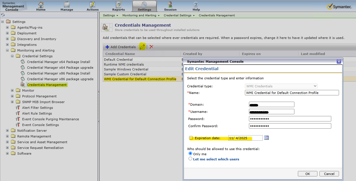 First, in the Symantec Management Console, navigate to Settings > All Settings > Monitoring and Alerting > Credential Settings > Credentials Management. Highlight the WMI Credential for the Default Connection Profile credential and click the pencil icon in the grey menu bar above. Either change the Expiration date to a date in the future or uncheck the check box for Expiration date as desired: