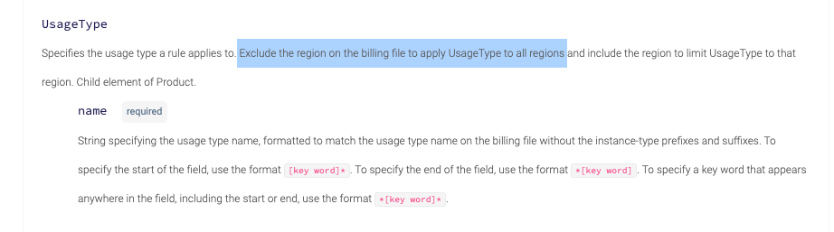 Example: First billing rule has <UsageType name=“TimedStorage-ByteHrs”/>. This will apply rate to all regions. The resolution involves including the region name "e.g USE1" into the prefix as such <UsageType name=“USE1-TimedStorage-ByteHrs”/>