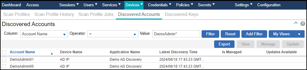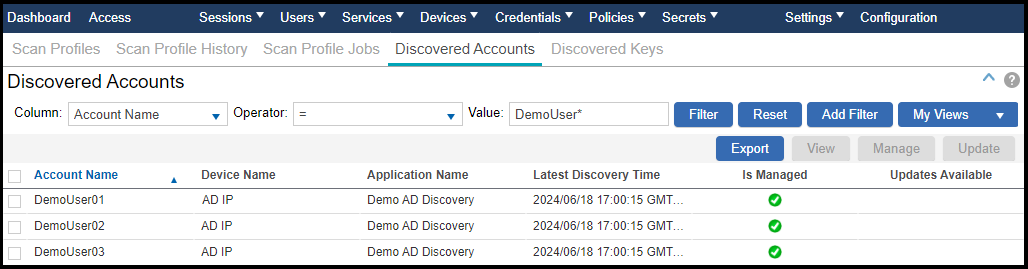 In this case, the userPrincipalName values were corrected in Active Directory to match the displayName and distinguishedName values. When the discovery job was run again, PAM now listed the discovered accounts as DemoUser04 and DemoUser05.
