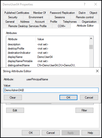 In this case, the distinguishedName and displayName values for the new accounts correctly said DemoUser04/DemoUser05, but the userPrincipalName values were incorrectly set to DemoAdmin04/DemoAdmin05.