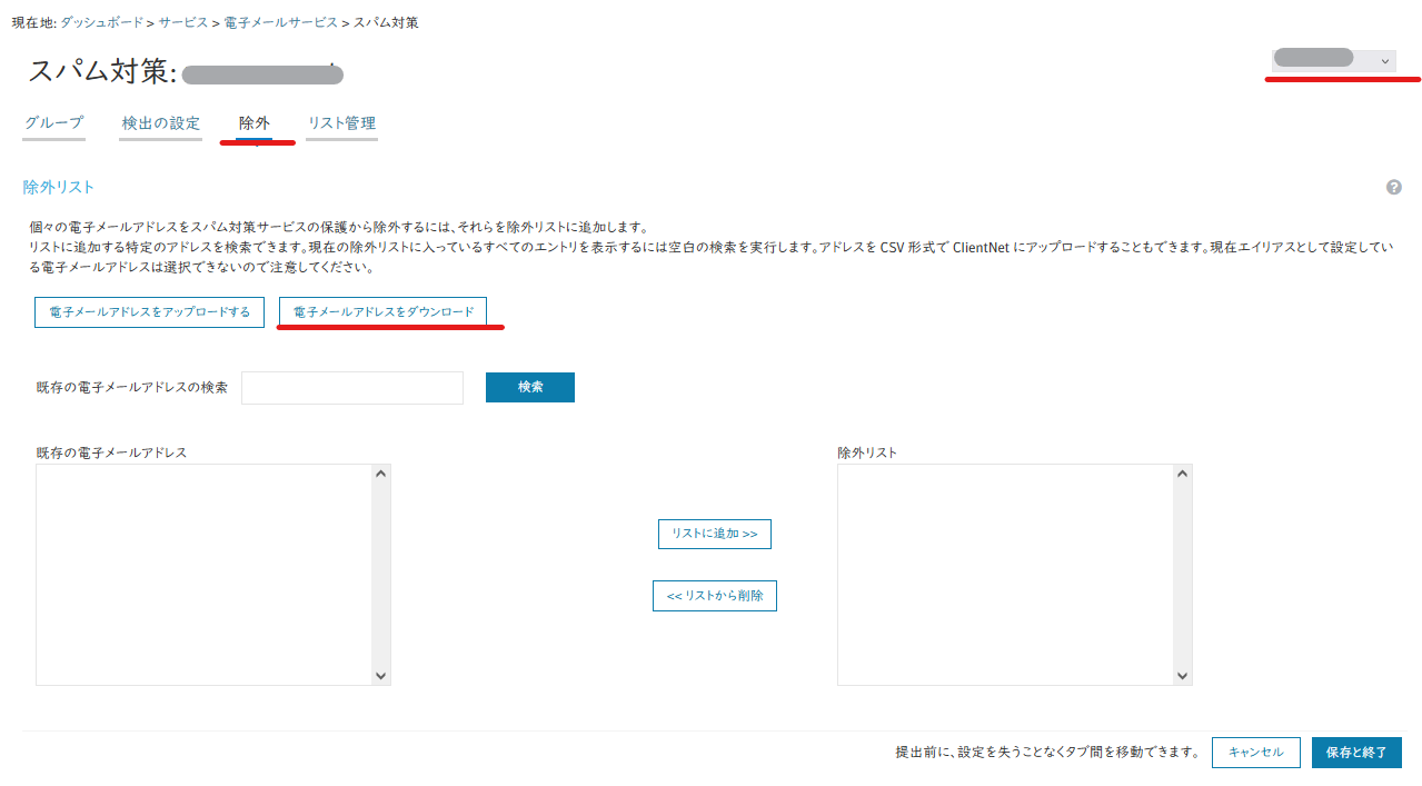 以下の手順にてスパム対策除外リストに登録されている電子メールアドレスをダウンロードすることが可能です。