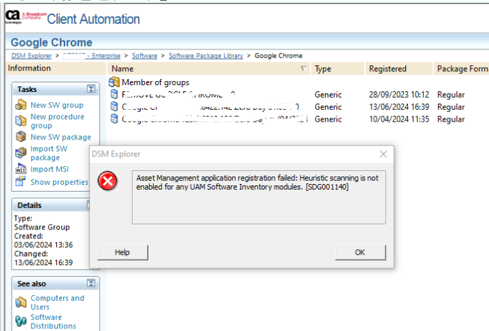 "Asset Management application registration failed: Heuristic scanning is not enabled for any UAM Software Inventory modules. [SDG001140]"