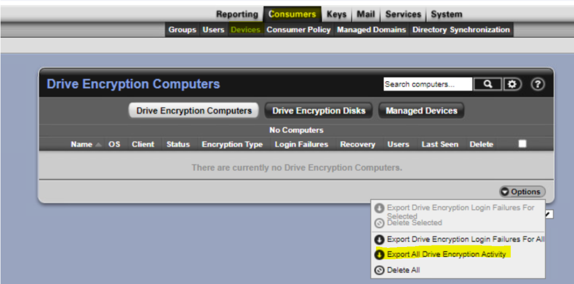 Go to Consumers => Devices =>From the drop down menu of OPTIONS=> Select "Export all Drive Encryption Activity"