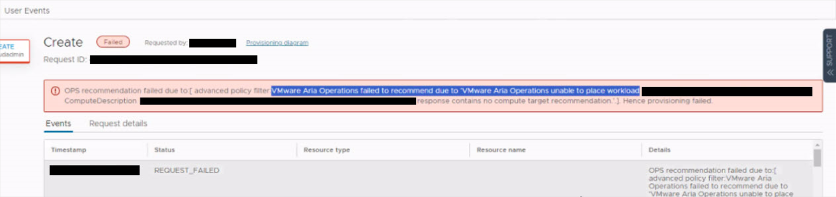 OPS recommendation failed due to [ advanced policy filter: VMware Aria Operations failed to recommend due to "VMware Aria Operations unable to place workload.[....] response contains no compute target recommendation.'.]. Hence provisioning failed.
