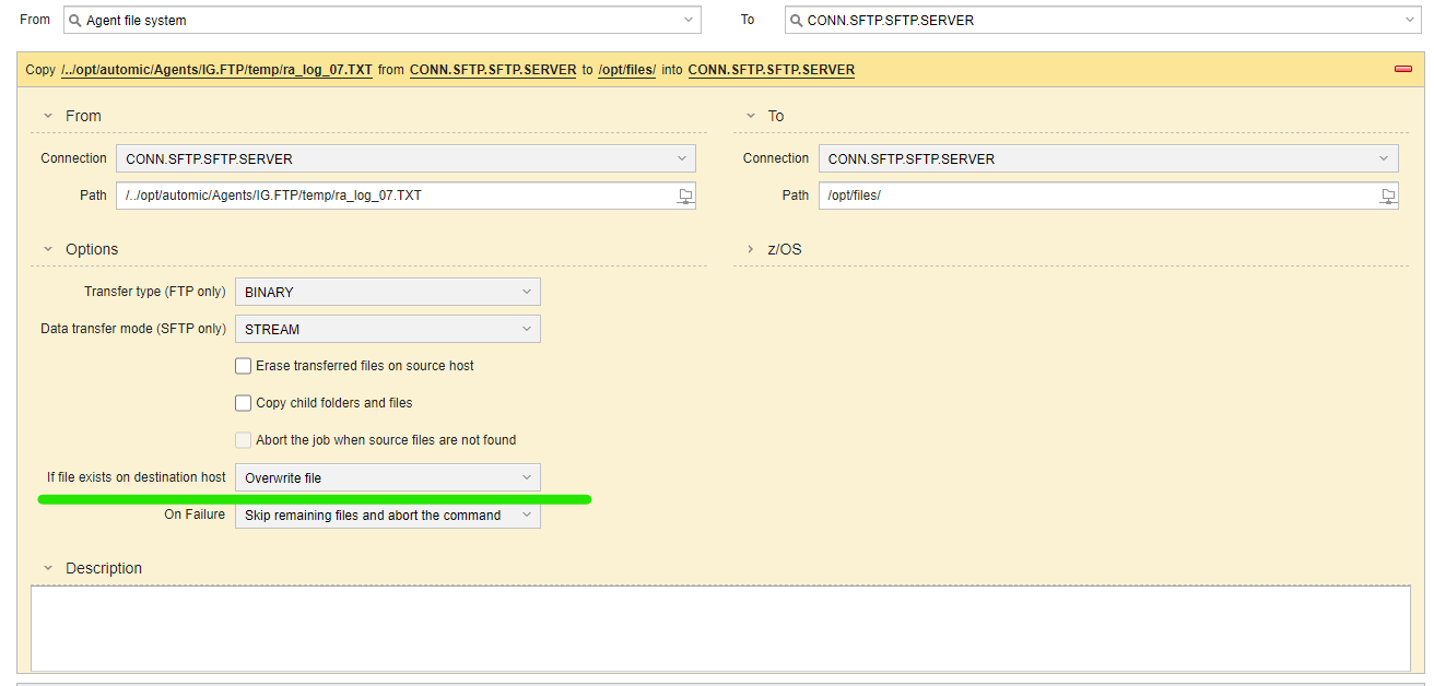 An FTP job does not overwrite the file on the destination host, even though the option 'Overwrite file' is chosen.
