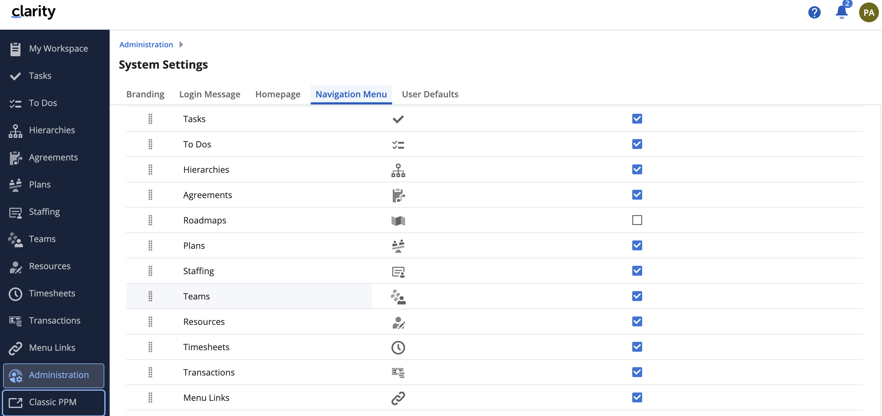 The roadmap menu item was removed from the Clarity administration side and restored.