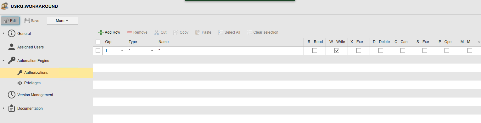 Workaround: Add a user group to all affected users with all object types having the write authorization.