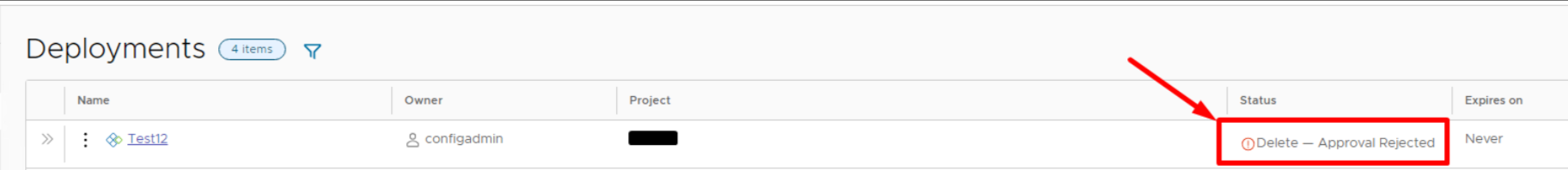 1. Locate the deployment with the "Delete - Approval Rejected" status.