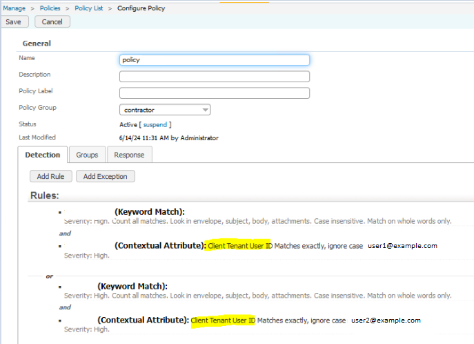 Contextual attribute such as Client Tenant User ID based on the users email address. Please notice each user is separated by OR and duplicated they keyword policy.