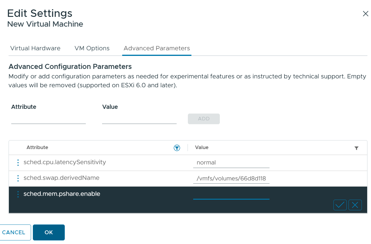 When attempting to remove an attribute in a VM's Advanced Parameters section, by first searching/filtering for it, and then clicking on the 3 dots on the left to "Remove," the attribute will stay.