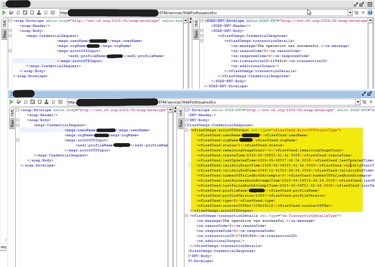Symptoms: During the SOAP call to fetchCredential, the user details (arcotOTPOutput) are missing in SP5 release but can be seen returning all elements in the second screen shot.