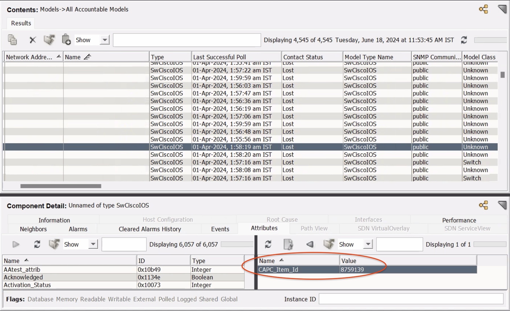 Restarting the SpectroSERVER and OneClick servers makes no difference. There is a CAPC_Item_Id value which means these device models were at one stage integrated with the associated Items in DX NetOps CA Performance Management:
