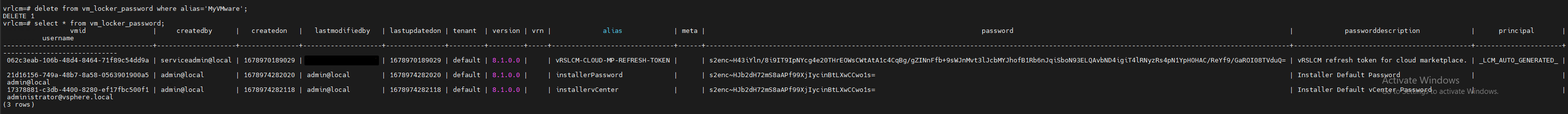 5. Run the below command to retrieve the data from the "vm_locker_password" table and locate the MyVMware credential Alias from the list.