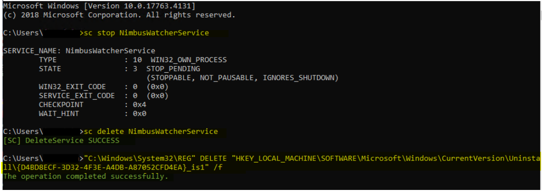 --(Eg:rmdir /s /q "C:\Program Files (x86)\Nimsoft")sc stop NimbusWatcherServicesc delete NimbusWatcherService"C:\Windows\System32\REG" DELETE "HKEY_LOCAL_MACHINE\SOFTWARE\Microsoft\Windows\CurrentVersion\Uninstall\{D4BD8ECF-3D32-4F3E-A4DB-A87052CFD4EA}_is1" /frmdir /s /q <UIM_INSTALL_FOLDER>