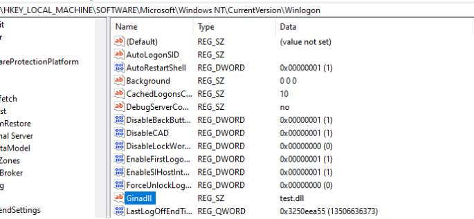 Create the registry key REG_SZ HKEY_LOCAL_MACHINE\SOFTWARE\Microsoft\Windows NT\CurrentVersion\Winlogon\GinaDll with test.dll as value