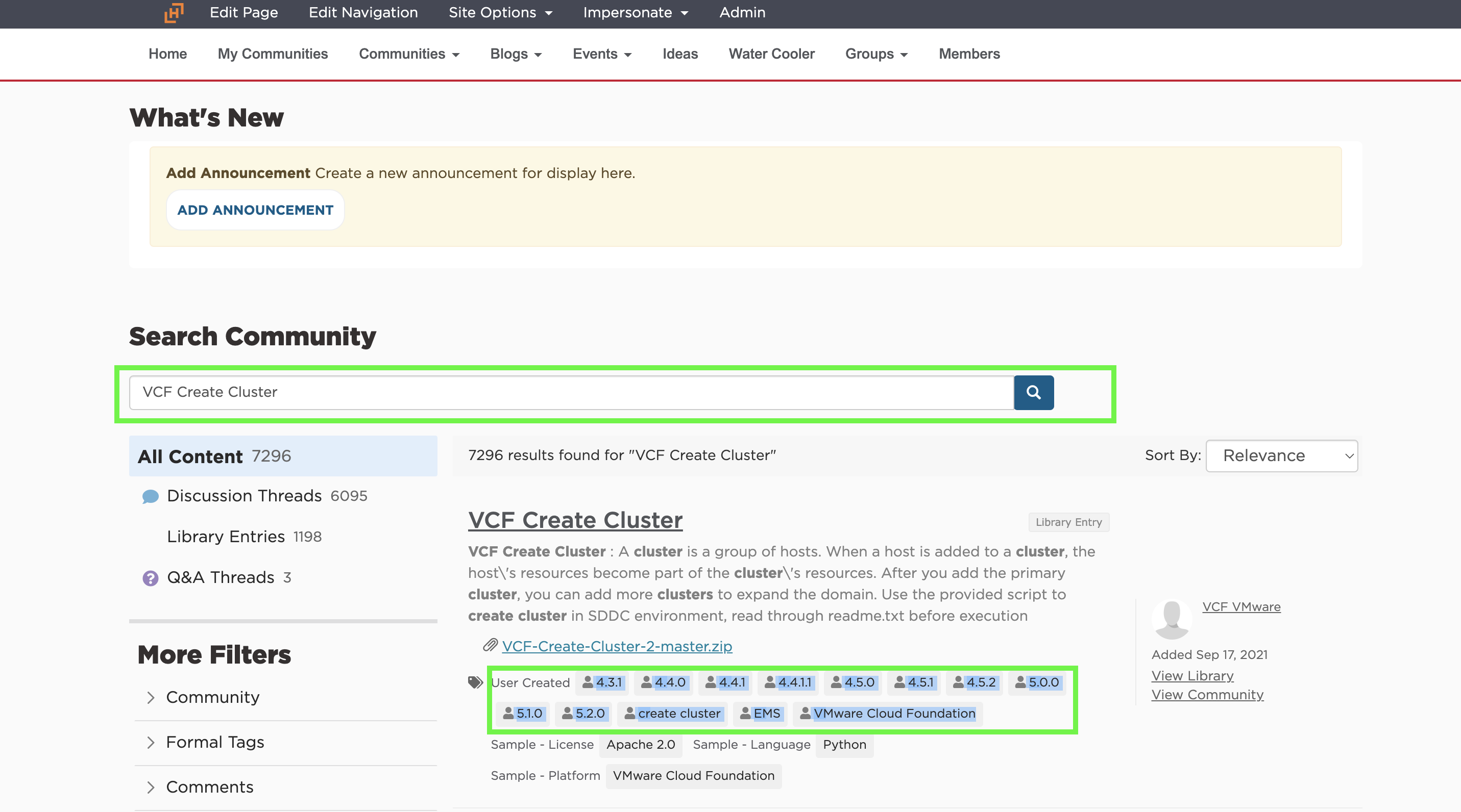 Above is a sample screenshot on how the search result looks when you search for "VCF Create Cluster" code sample and highlighted the Tags link to look for before downloading the script for specific release.