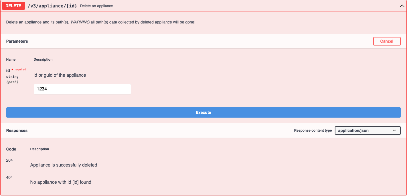 3. Expand Appliance and click on Delete /v3/appliance/{id} > try it out > populate monitoring point id > click execute