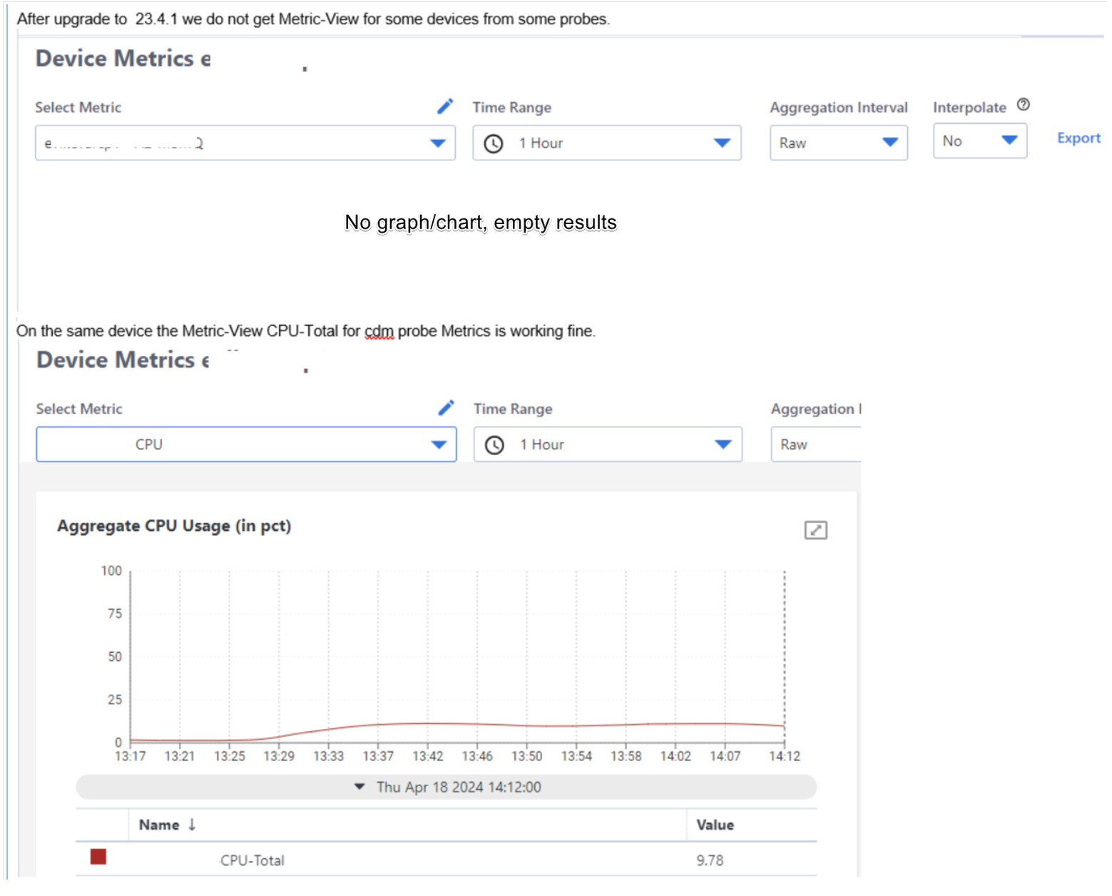 After upgrading to DX UIM 23.4.1 when trying to create a Metrics view in the Operator console, OC Metrics Viewer is not generating graphs/chafts for servers monitored by the vmware probe and some other probes.